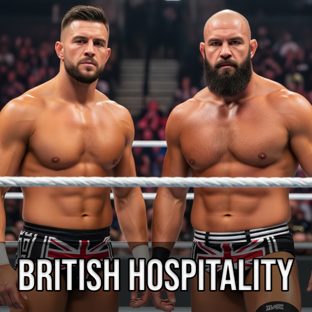 The camera cuts backstage, where William Smith is waiting with a microphone. He is joined by the two members of British Hospitality, Harry Black and Alexander Hate. Both men are dressed in their wrestling gear, looking ready for a fight. They have a serious but determined look on their faces.