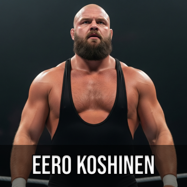 The jazzy tune abruptly stops and is replaced by a dark, foreboding metal track with a slow, heavy bassline and deep, guttural guitar riffs. A hush falls over the crowd as a stoic Eero Koshinen makes his way to the ring. He’s wearing a plain black singlet that highlights his immense size. He has a stone-cold expression on his face, a testament to his intimidating and stoic persona.