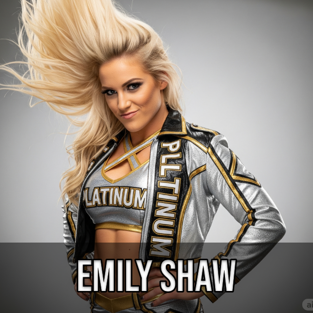 The lights in the Stratford Arena go dark as a high-energy electronic track with a driving beat, “A Royal Pain,” blasts through the sound system. The crowd immediately begins to boo as ‘Platinum’ Emily Shaw makes her way to the ring, with a smug grin on her face. She’s wearing a silver and gold ring jacket with “Platinum” emblazoned on the back and matching gear. She blows a kiss to the booing crowd before flipping her long blonde hair and winking at a few people in the front row.