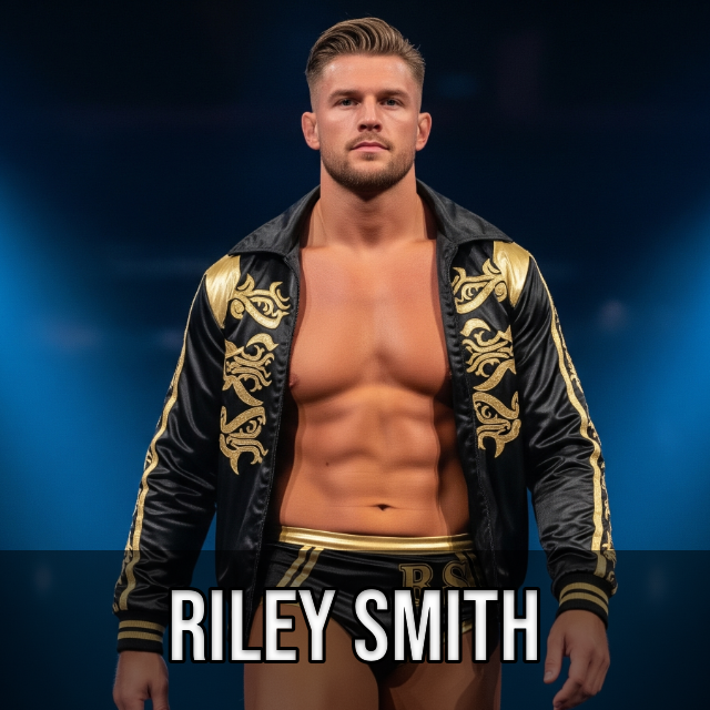 As Oliver Reed poses in the center of the ring, the music abruptly changes to a high-energy pop-rock anthem. The crowd boos loudly as ‘The Golden Boy’ Riley Smith makes his way to the ring, with a smug grin on his face. He’s wearing a sparkly black and gold satin ring jacket and black trunks with a gold trim. He blows a kiss to the booing crowd before entering the ring and winking at a few people in the front row.