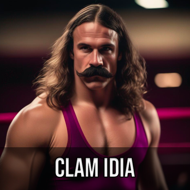 CLAM IDIA jogs out. He’s a competent-looking but plain mid-card wrestler, clearly outmatched in size and star power. He waves a little too enthusiastically to the crowd, who barely react. He slides into the ring, looking slightly overwhelmed by the presence of both Adder and Izaz.
