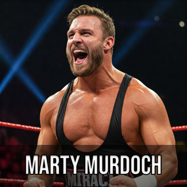 MARTY MURDOCH sprints out, a popular, hard-hitting mid-carder known for his tenacity. He pumps his fists to the crowd, getting a respectable cheer. Murdoch enters the ring and immediately glares at both Izaz and Adder, clearly not intimidated.