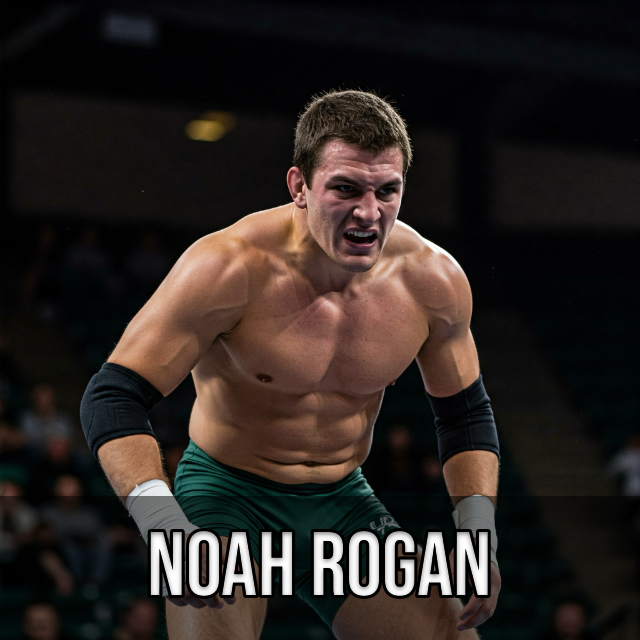 NOAH ROGAN emerges from the back. He’s dressed in simple black trunks with green trim, his demeanour focused and intense. Rogan is athletic and quick, acknowledged by the crowd but not yet a top star. He acknowledges the fans with a quick nod, steps over the top rope, and immediately starts stretching, his eyes locked on the entranceway.